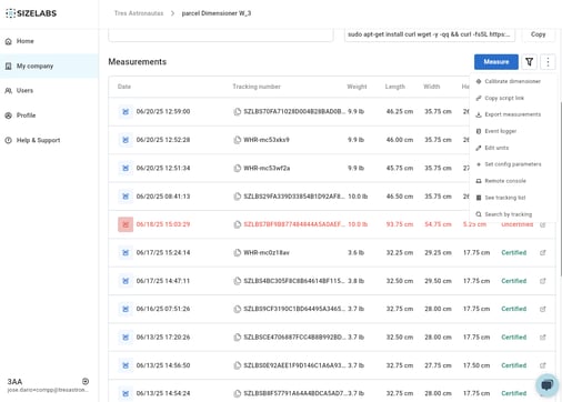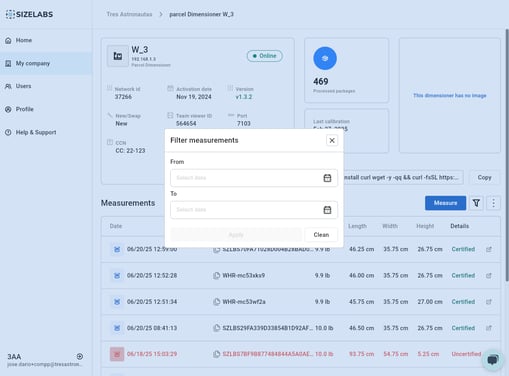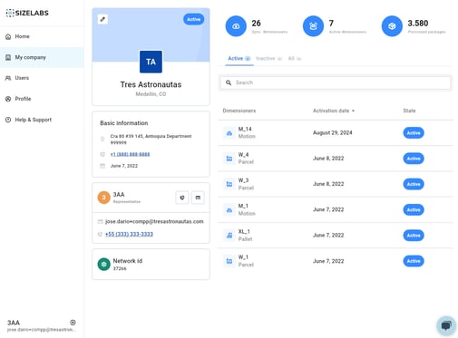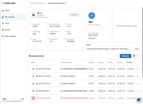 The My Company section is your hub to manage your company's basic data, oversee your dimensioners, and interact with device-specific measurement information.