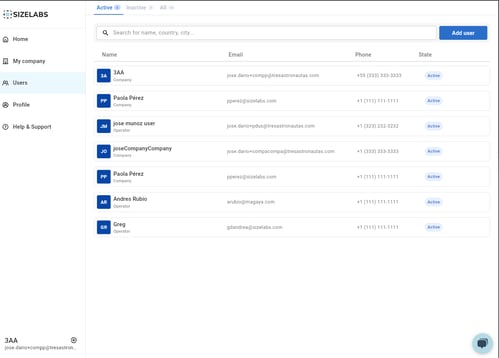 The Users section allows you to manage all users registered under your company account. You can filter, search, view, edit, deactivate, and add users of different roles.